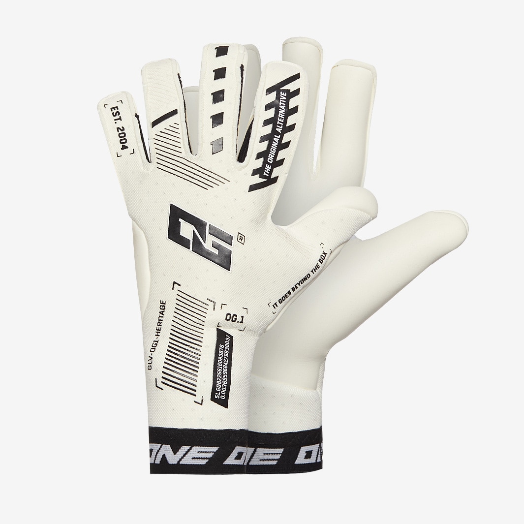 Display your matchwinning agility wearing ONE Kids OG1 Heritage Hyla Cut goalkeeper gloves in WhiteBlackCool Grey, a special launch edition of the new OG1 with graphics celebrating ONEs 20th anniversary. Lightweight and formfitting, the OG1 wraps the hand like a second skin, minimising distractions while providing ultimate grip thanks to its elitetier Pro Grade Contact latex. Part of ONEs new generation of gloves, its the successor to the popular GEO series and if you liked the GEO, youll love the OG1. The ergonomic, breathable UrgoTract body has been tweaked to perfection, with adjustments made to the composition and shaping of the material to achieve a superior fit and feel. Every aspect of the glove is streamlined, from the latex wraps and extended palm to the clean and comfortable wrist entry. Theres a removable strap in the pack, of course, for those that prefer a touch of the traditional. On the inside, the glove benefits from the latest Echo Form 2.0 tech, with strategically placed silicone elements at the fingertips, thumb, and palm helping to prevent internal slippage and keep you fully locked in during play. Heritage launch edition with OG 20th anniversary graphics Latex Palm 4mm Pro Grade Contact Cut Hyla flat at base of fingers, stitchless rollfinger at tips Strap Elasticated, single wrap, removable Wrist Entry NEW Quantum Elastic, strapless Body Urgotract ergonomic and breathable Spines No Internal Grip NEW Echo Form 2.0 NEW Improved XWrap locks glove to hand without restriction NEW Extended palm construction Lightweight onepiece construction size 9 weighs just 95g Elite in dry conditions great in wet good durability