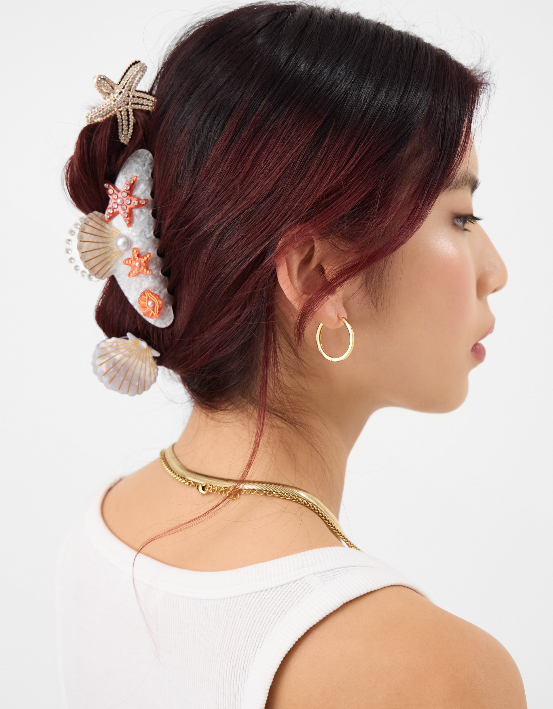 Inspired by the beauty found in the ocean, these claw clips are a must for your next sunny holiday. Included is a starfish design bedazzled with diamantes, a scallop shell with a pearlescent finish and a glitzy style with orange star fish and oyster motifs on both sides. Sold as a set.