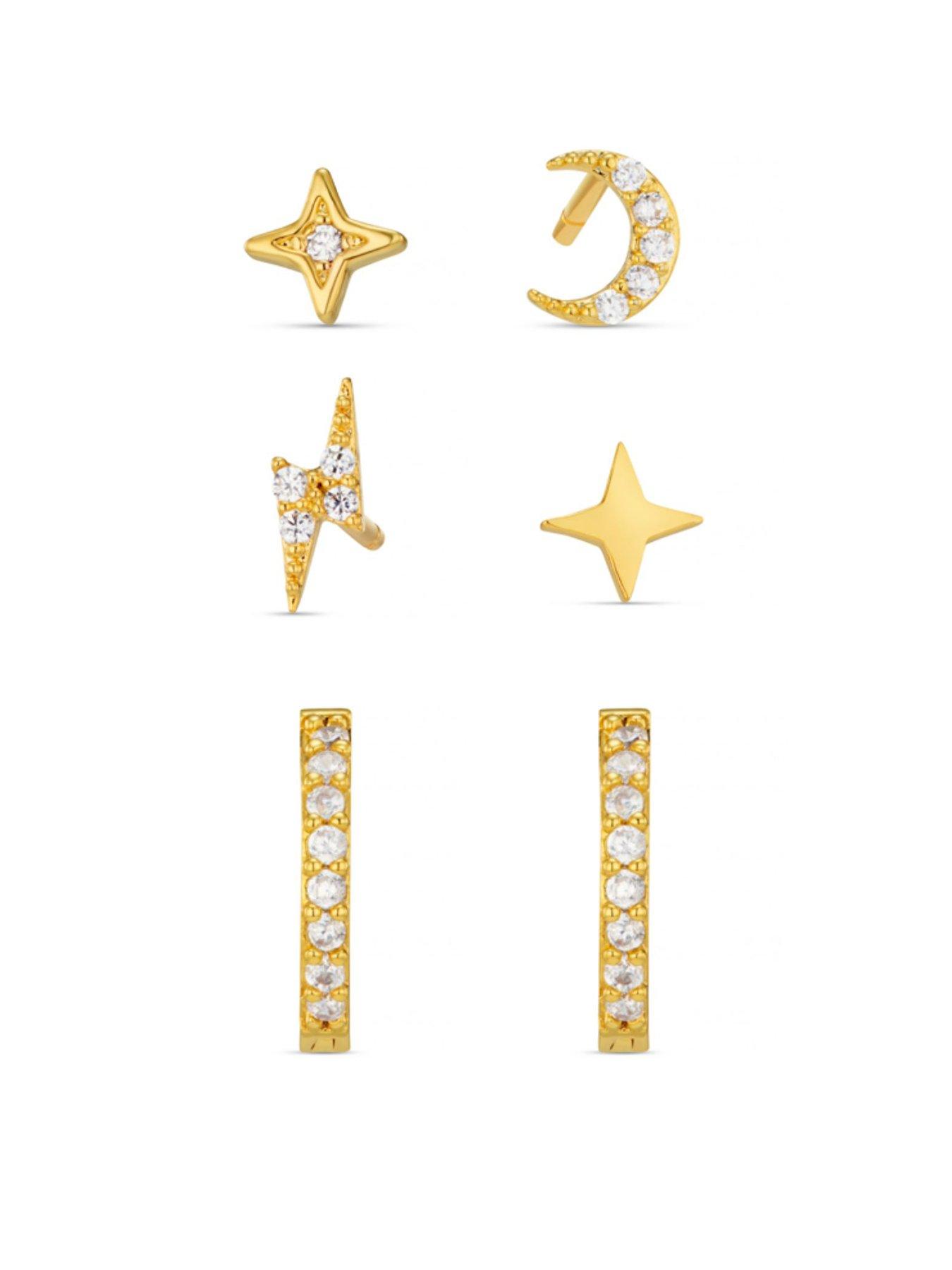 Orelia Mixed Celestial Stud & Pave Micro Hoop Pack Size & Fit Available in one size Details Mixed Celestial Stud & Pave Micro Hoop Pack by Orelia Gold A pack of earrings, with a pair of pave micro hoops, and a single pave lightning bolt, single pave moon, a pave star, and a smooth star Plated in 18k gold Wear separately for a statement look, or together for a stunning tiered look Fashion Jewellery Type: Earrings Metal Type: Base Metal
