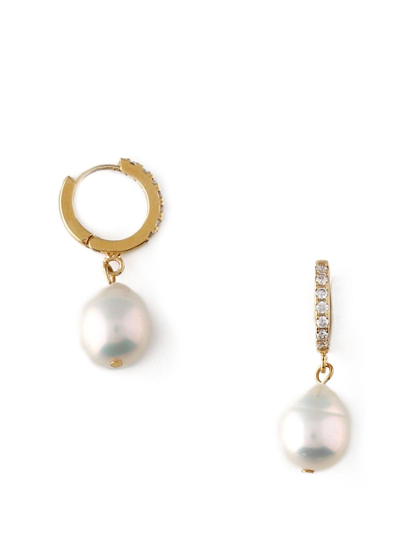 Orelia Pearl Drop Pave Hoop Earrings Due to the authentic nature of the freshwater pearls, these may vary in shape and size compared to the images. Our favourite pearl trend with a twist, these Pearl Drop Pav???? Huggie Hoop Earrings are the updated version of the classic. These delicate huggies feature a freshwater pearl charm attached to an easy to wear Pav???? encrusted gold huggie hoop earring. Please note, earrings are non-returnable unless faulty. Height: 25 MM Width: 1.2 CM Fashion Jewellery Type: Earrings 18k Gold Plated Freshwater Pearls