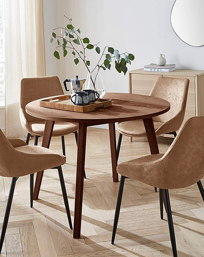 This Package includes the Round Oslo dining table with Retro Leg design and 4 Etta Faux Leather Chairs. Self assembly required.