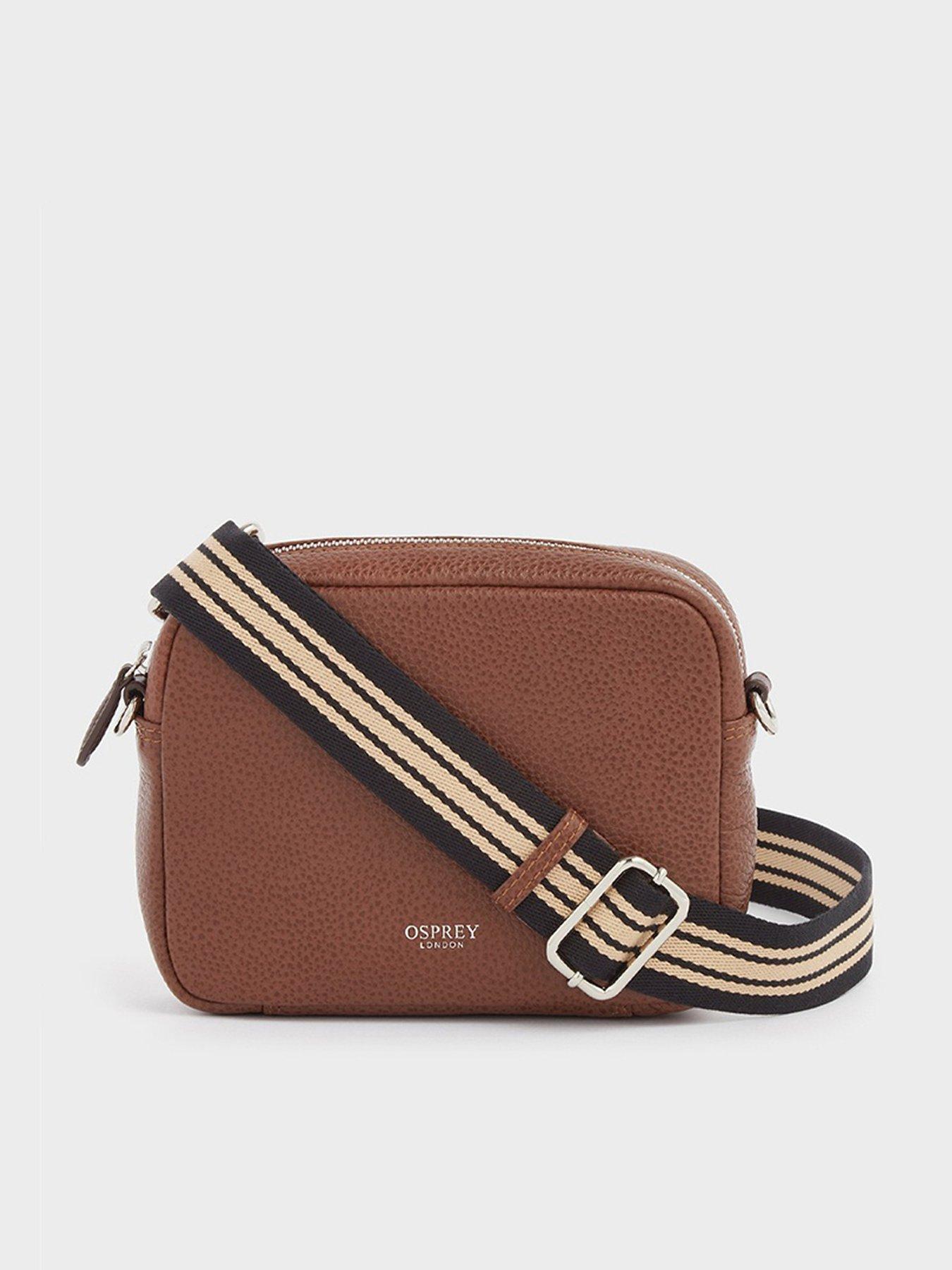 Osprey London The Chiswick Crossbody Size & Fit One size Dimensions: height: 17cm x width: 21cm x depth: 7cm Strap drop: 36-63cm Details The Chiswick Crossbody by Osprey London Brown This chic new convertible is expertly crafted in sumptuous dark tan Grainy Hide leather Detachable and fully adjustable varsity-inspired webbing strap OSPREY LONDON logo embossed in silver on the front Zipped pocket to the reverse Zip closure at the top Lined in black jacquard fabric Internal slip pocket and a zipped pocket Comes with an OSPREY LONDON dustbag Material & Care Material Content: Leather Washing Instructions: Wipe Clean