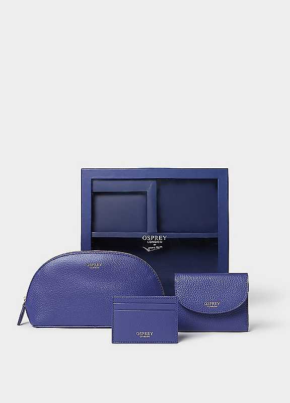 Presented in an elegant Osprey London gift box, this coordinated trio is crafted in supple grainy leather. Inside, you'll find a spacious yet sleek makeup bag for beauty essentials, a slim and practical card holder for everyday use, and a compact purse with timeless appeal. Thoughtfully designed and beautifully made, this set is stylish, versatile, and ready to impress, whether you're treating someone special or indulging yourself.LeatherMake-up bag dimensions approx. 13H x 21L x 6W cmPurse dimensions approx. 9.5H x 12L x 4W cmCardholder approx. 7H x 10L x 0.5W cmGift set dimensions approx. 27 x 27 x 7 cm