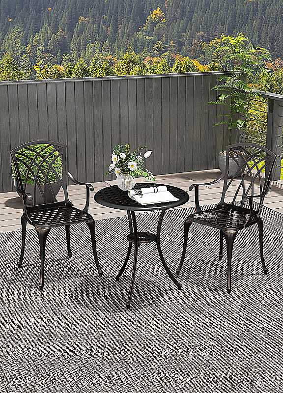 This three-piece bistro set includes two chairs with armrests and a matching round garden table, great for your balcony, patio, garden, pool, or any other outdoor space. Made from a cast aluminium frame for strength, resistance to rusting, and toughness, the garden table and chairs are reliable for outdoor use all year round. The chair backs are moulded into an attractive cut-out design.Umbrella holder: Hole in the middle of table keeps the parasol securely in place so you are protected from the sun's glareAdjustable feet: Anti-slip to keep each piece of this patio furniture set level and in place, they protect your floor from damageMaximum load weight: Chair: 160kg, Table: 70kgEasy to assembleChair dimensions approx. 89H x 52W x 51.5D cmTable size approx. 66H x 61D cm