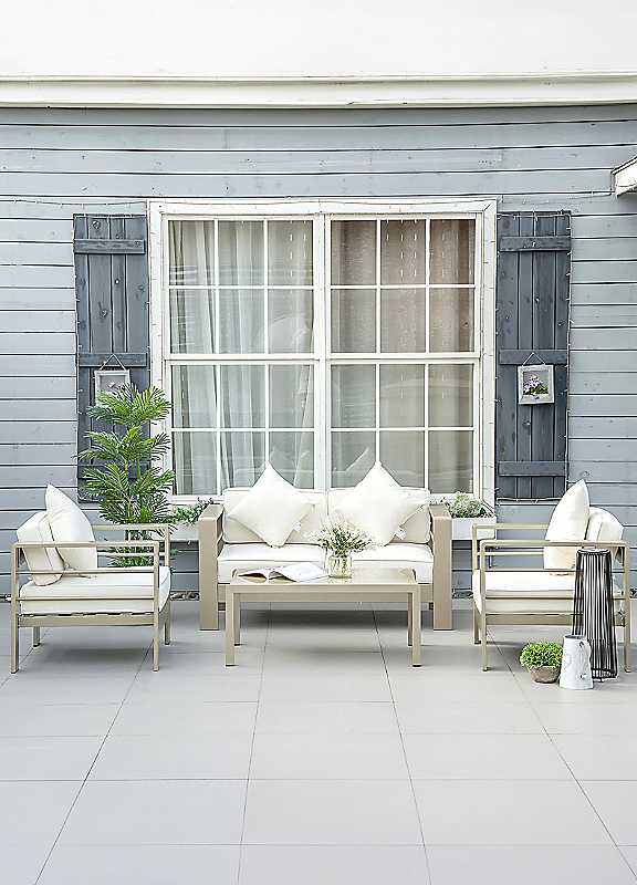 This four-piece aluminium garden furniture set comes with a loveseat, two armchairs and a matching coffee table - ideal for seating friends and family outside together. Padded seat and back cushions, with removable and washable cushion covers.Tempered glass table: Strong surface in a sleek look, offering a handy place to keep things close by as you relax into this garden furniture setComfortable: Wide seating and high backs of the sofa and chairs, in this aluminium garden sofa set, offer plenty of resting roomAluminium frames: Powder coated metal garden furniture set for strong support, in a beautiful champagne gold coloured finishAssembly requiredLoveseat dimensions approx. 138W x 70D x 63H cmChair dimensions approx. 81W x 70D x 63H cmTable dimensions approx. 96L x 60W x 41H cm