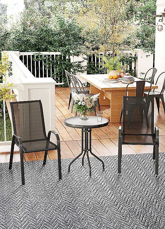 Three-piece garden bistro set includes two stackable chairs and a round table with a tempered glass top. Sit and enjoy meals, drinks and relaxation outdoors with family or friends. Perfect for gardens and small patios and balcony spaces.Stackable chairs: Easy to place on top of each other - stackable outdoor chairs are easy to store away and also saves spaceSteel frames: Powder coated for extra strength, this outdoor garden table and chairs set is tough. Suitable for outdoor useMesh seat panels: Sit comfortably on both chairs of this outdoor dining set. Breathable - suitable for hotter days and eveningsMaximum load: Table: 50kg, Chair: 120kgAssembly requiredTable size approx. 71H x 60D cmChair dimensions approx. 93H x 54W x 71D cm