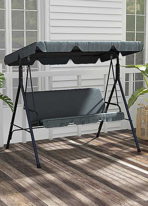This three-seat swing seat is perfect for entertaining or relaxing in the garden. It features an 'A'-shaped steel frame for even stability and powder coating for extra strength and durability. The swing chair also has foot pads for balance and floor protection. The swing bench comes with a removable cushion and slightly angled back and armrests. The weather-resistant swing seat has a canopy to shield below from sun glare, UV rays, and mild rain.Maximum load 240kgAssembly requiredDimensions approx. 153H x 172L x 110W cmSeat dimensions approx. 45H x 130L x 46W cm