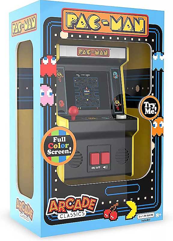 Munch on Pac-Dots, navigate tricky mazes, and avoid those pesky ghosts with the Arcade Classics Pac-Man! This retro, mini arcade game is a miniaturized version of the classic Pac-Man game you know and love. Featuring authentic gameplay, graphics, and sounds, the Arcade Classics Pac-Man will transport you back to your childhood in a wave of nostalgia. And with its full-colour screen, you can enjoy enhanced gameplay as you take the controls! Kids and kids-at-heart will love the thrill of guiding their favourite yellow character through the mazes to eat all the dots and power-ups. Just don't get caught by Blinky, Pinky, Inky and Clyde! Display your Arcade Classics toy in your game room collection or on your desk for an added touch of retro fun. Makes a great birthday gift or holiday gift for kids and collectors ages 8 and older. 8+ years Includes 3 AA batteries so you can play right away