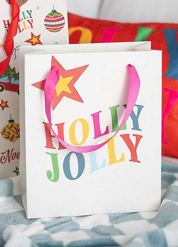 Make your gift-giving extra festive with this 23cm gift bag, featuring colourful 'holly jolly' text. Featuring a cheerful design to add a fun touch to gifts for loved ones.