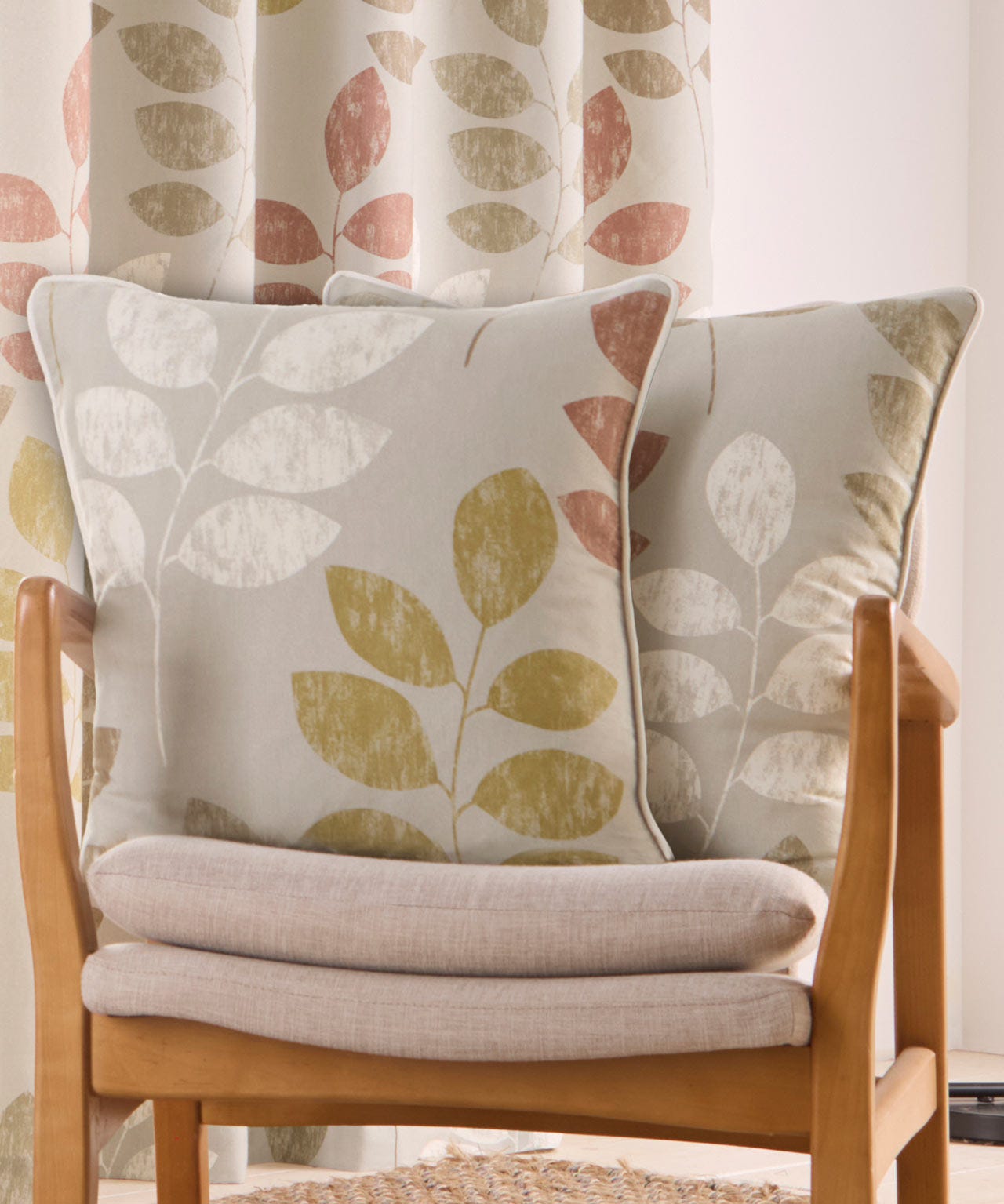 Give a fresh look to your sofa or bed with this pair of modern leaf print cushion covers. Made from a quality cotton blend fabric. Matching curtain available to complete the look. Machine washable. 70% Polyester, 30% Cotton. Size: 43x43cm approx.