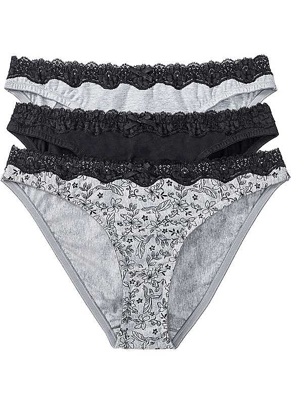 Three briefs with stretch lace detailing at the front and back. Washable Pack of 3 Colour mix 1: 1 x Champagne, 1 x Taupe & 1 x Champagne/Taupe Print Colour mix 2: 1 x Black, 1 x Grey Marl & 1 x Grey Marl/Black Print