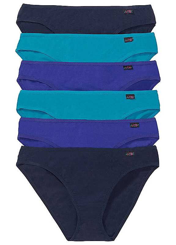 A pack of 6 stretch cotton briefs with a small label at the hip. Pack of 6 Washable 95% Cotton, 5% Elastane Pack 1: 2 Black, 3 White & 1 Grey Pack 2: 2 Purple, 2 Dark Purple & 2 Lavender Pack 3: 2 Turquoise, 2 Blue & 2 Aqua Pack 4: 6 Black Pack 5: 2 Sapphire, 2 Turquoise & 2 Dark Blue