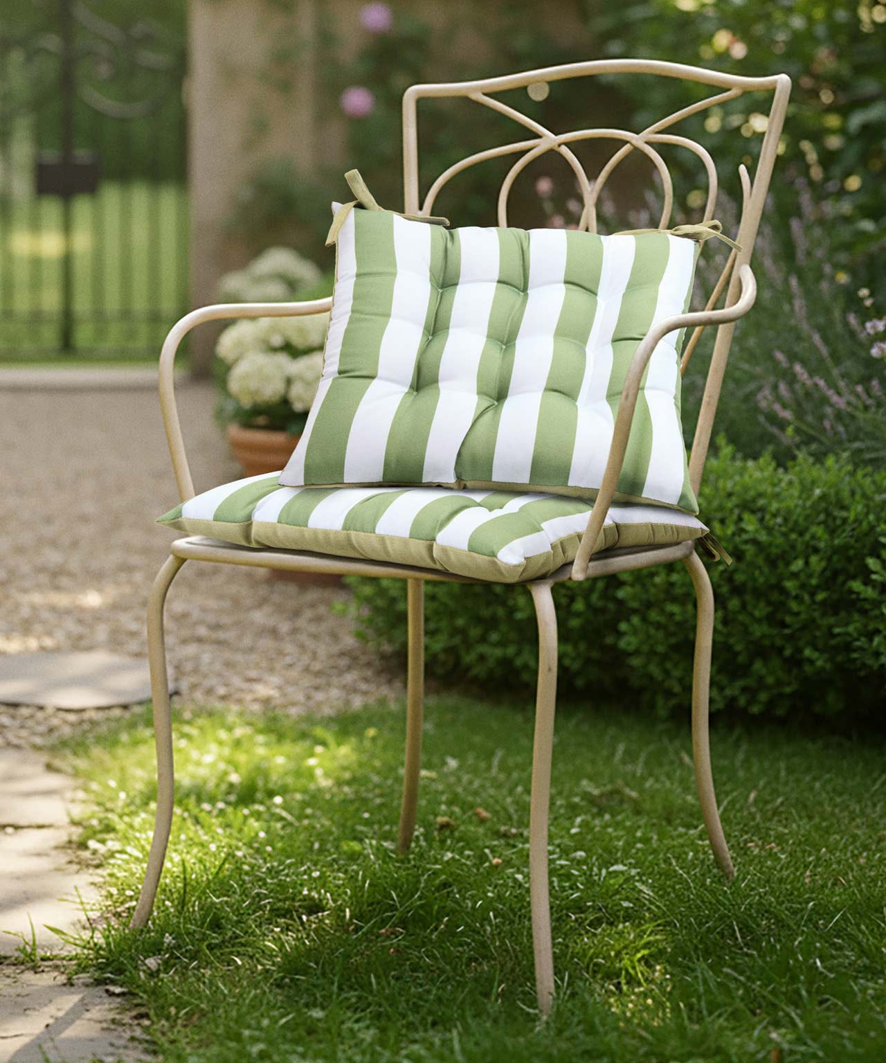 Softly cushioned for comfort on garden furniture or hard dining chairs, this pair of seat pads are practical and stylish. In a summer-perfect bee and flower print. Tie on and wipe clean for ease. Wipe clean only. 100% Polyester. Filling: 100% Polyester Hollowfibre. Size: 40x40x5cm approx.