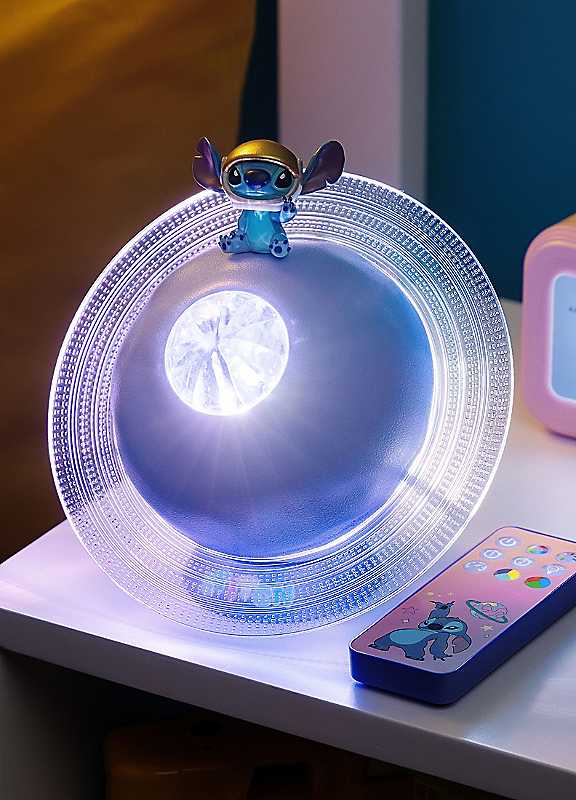 Bring outer space into your room with this Disney Stitch Galaxy Projection Light. Includes a remote colour, plus colour phasing, colour select and auto-off night light modes. Standing at 14cm (5.5in) tall, this magical galaxy projection light features Stitch in a space helmet sat upon a planet, ready to fill your space with calming and colourful projections. The light offers a range of modes - all of which you can effortlessly control with a remote - including colour phasing, colour select, and a night time mode with an auto off timer to help you relax before sleeping.Power your light by charging it up (includes USB charging cable). Once charged, it's cordless so you can easily move it around. The remote control requires 2x AAA batteries (not included).The Stitch Galaxy Projection Light is great for creating a cosy environment in your home or bedroom.