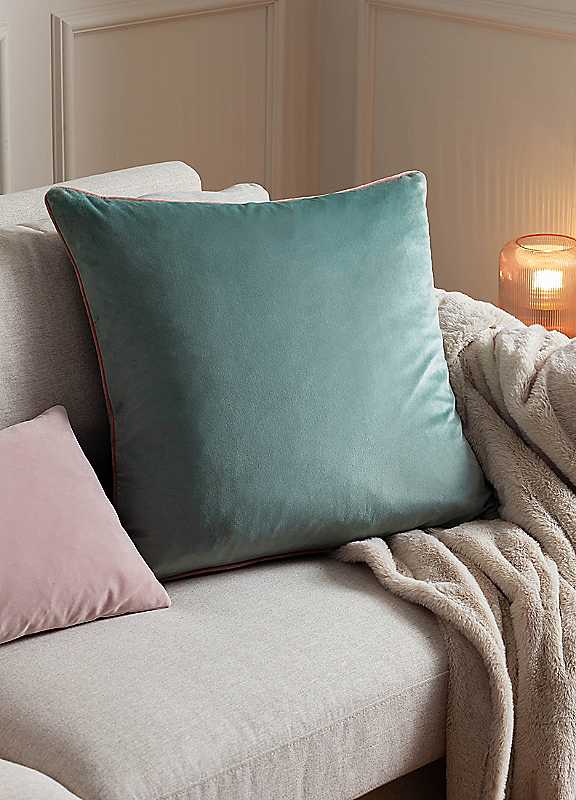 Large velvet cushion with contrast colour piping. Brand: Paoletti Machine washable 100% Cotton Filling: 100% Polyester Dimensions approx. 55 x 55 cm (21½ x 21½ in) | velvet pillows, polyester filled pillows, cotton filled pillows, velvet cushions, machine washable pillows, modern accent pillows, large square pillows