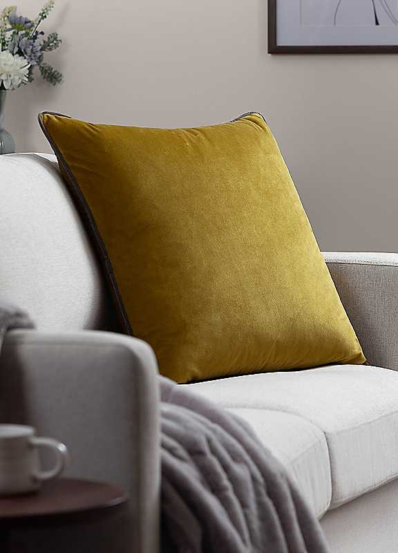 Large velvet cushion with contrast colour piping. Brand: Paoletti Machine washable 100% Cotton Filling: 100% Polyester Dimensions approx. 55 x 55 cm (21½ x 21½ in) | olive green cushions, machine washable pillows, modern couch pillows, polyester filled pillows, cotton filled pillows, large square pillows, velvet cushions