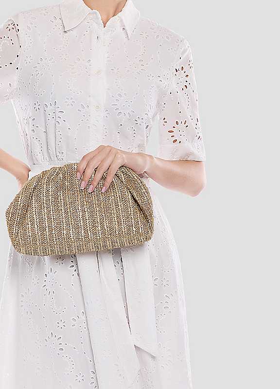 Discover your new go-to summer clutch bag! The Ocean Raffia Clutch Bag by Paradox London is pleated soft clutch raffia bag designed to hold all your essentials while adding a glamorous finish to your holiday look, effortlessly taking you from day to night.Upper & Lining: Synthetic