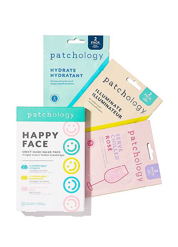 Say goodbye to dull, dry skin with the Happy Face Kit, featuring 2 Illuminate, 2 Hydrate, and 2 Ros© sheet masks.Illuminate: Brightens with Vitamin C, Liquorice, and Grapefruit Seed Extracts.Hydrate: Deeply moisturizes with Hyaluronic Acid and Vitamin B5.Ros©: Calms and hydrates with Strawberry Extract, Resveratrol, and Hyaluronic Acid.Perfect for all skin types, these masks are key for your next self-care night in. Patchology sheet mask duo packs come in a resealable pouch.How to Use:Step 1 - Start by washing your face with a gentle cleanser to remove any makeup, dirt, or oils. Pat your face dry with a clean towel to ensure your skin is clean and dry before application.Step 2 - Place the sheet mask over your entire face, aligning the holes with your eyes, nose, and mouth. Press the mask snugly into the contours of your face to ensure good contact with your skin.Step 3 - Kick back and wear the mask for at least 10 minutes. Feel free to extend your spa moment if you're in the mood for extra hydration.Step 4 - Gently peel the mask off your face and discard it.Step 5- There is no need to rinse your face. The serum from the mask will fully absorb into your skin. After removing the mask, proceed with your usual skincare routine, such as applying moisturiser or other treatments.