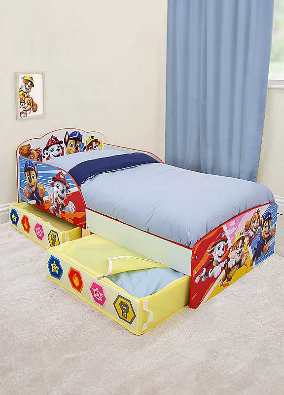 Heroic, brave and colourful, Paw Patrol is loved by children around the world, inspiring play and inclusion from a young age. Officially licensed, our Paw Patrol Toddler Bed with Underbed Storage features the Paw Patrol gang, with Skye, Marshall, Chase and Rubble on the headboard, at the foot of the bed, and on the sides, with their badges printed on the storage boxes.The bed makes use of the potential storage space under the bed with 2 fabric underbed drawers. The draws are colourful and fun, and can be zipped closed, keeping the contents inside dust free, perfect for storing toys, games, and spare bedding. The bed is designed to be toddler sized, so it's low to the ground to make getting in and out of bed easy for them.The bed also has side guards to let them sleep securely at night, building confidence and letting them enjoy bedtime. The bed is easy to assemble, with all the fixings included, with easy to follow step-by-step instructions. Made from high-quality MDF, the bed is durable, sturdy and built to last. Designed for children 18 months and up, the Paw Patrol bed takes a toddler sized mattress (140 x 70cm not included).Toddler bed2 fabric underbed drawers includedAssembly required - fixings & instructions includedSuitable from 18 months+Requires toddler sized mattress (140 x 70cm)Mattress not includedPlease remember to measure your available space before ordering. If using on an un-carpeted floor we recommend rubber or felt protection pads be used under the legs to avoid damage to your floors.