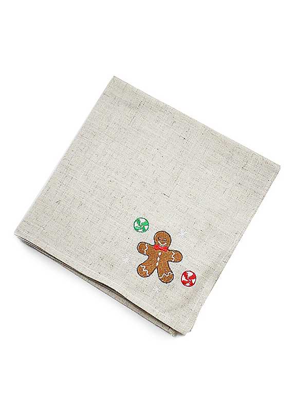 This Linen Mix Napkin brings Christmas cheer with its adorable embroidered gingerbread biscuits. Crafted from a luxurious linen blend, these napkins are perfect for adding a touch of whimsy to your seasonal table settings. Whether hosting gatherings or special occasions, this charming napkin is sure to be a delightful addition to your Christmas decor.Machine washable at 40°CLine dry80% Polyester, 20% LinenEach napkin size approx. 45 x 45 cm