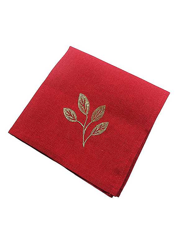 Add a touch of festive elegance to your table with this red Christmas napkin, beautifully embroidered with a delicate gold leaf design. Crafted from high-quality fabric, it offers a sophisticated yet timeless look, perfect for seasonal dining.Machine washable at 40°CLine dry100% PolyesterSize approx. 45 x 45 cm
