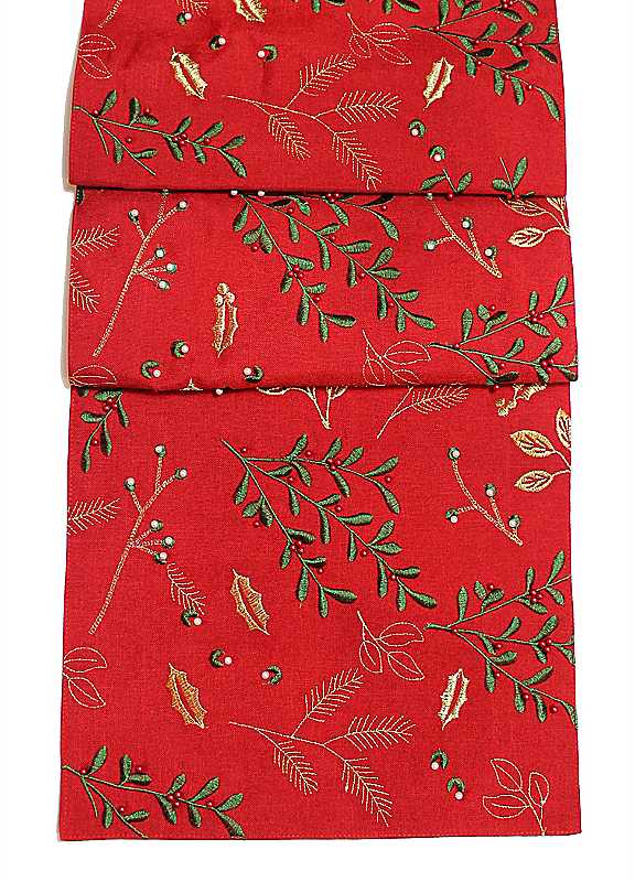 This festive beaded table runner features a rich red fabric with intricate embroidery of holly leaves, pine branches, and gold accents. Delicate bead embellishments add a touch of sparkle, making it perfect for enhancing dining tables or seasonal displays. Its elegant design brings warmth and sophistication to any festive setting.Spot clean onlyLine dryDo not iron100% PolyesterSize approx. 35 x 190 cm