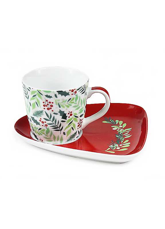 This charming mug and biscuit saucer set is ideal for enjoying hot drinks and snacks during the festive season. It's delightful holly and berry motif embodies the warmth of the Christmas season.PorcelainCup dimensions approx. 8 dia. x 11 x 7.5 cmSaucer dimensions approx. 17 x 14 cm