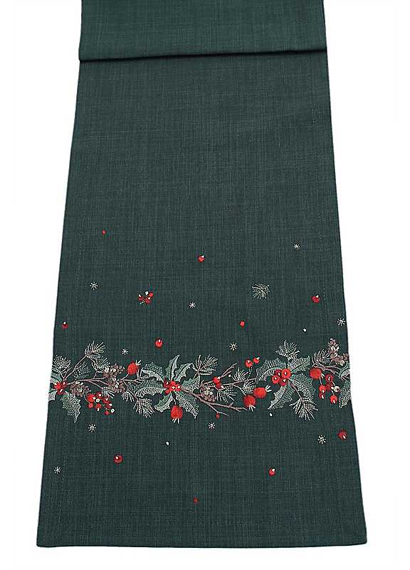 Adorn your table with festive beauty this Christmas with this stylish runner. Featuring a delicate embroidered design of holly leaves and berries, it adds a sophisticated and traditional touch to your dining setting. Perfect for creating a warm and inviting atmosphere for your Christmas gatherings.Machine washable at 40°CLine dry100% PolyesterSize approx. 35 x 190 cm
