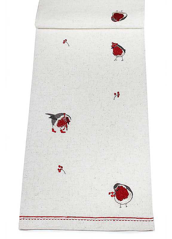 Bring a touch of festive charm to your dining table with this delightful Robin Riot table runner. The natural-toned fabric is adorned with embroidered robins and scattered red berries, creating a cheerful and distinctly British Christmas feel. This runner will add a subtle yet stylish festive touch to your seasonal gatherings.Machine washable at 40°CLine dry100% PolyesterSize approx. 35 x 190 cm