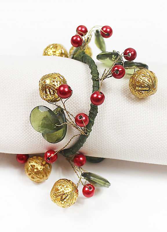 Add a touch of natural elegance to your Christmas table with these charming berry napkin rings. Featuring a delicate arrangement of red berries, gold textured baubles, and green leaves on a winding stem, they bring a festive and organic feel to your place settings. These napkin rings are the perfect finishing touch for a stylish Christmas dinner.Set of 4Blass BeadsPlastic BeadIronPaper RafiyaDiameter approx. 8 x 2 cm