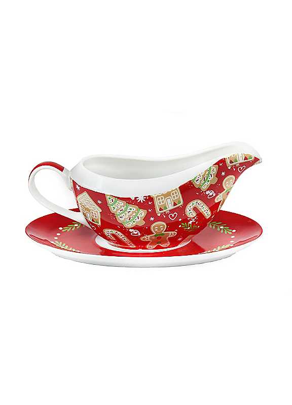 Complete your Christmas dinner table with our Gravy Boat and Saucer set, featuring a joyful gingerbread men and sugar cookies design. Perfect for serving warm gravies and sauces, this set is as practical as it is festive. The matching saucer catches any drips, keeping your table clean. Crafted from new bone china, this set is both durable and stylish, making it a timeless addition to your Christmas tableware.New Bone China
