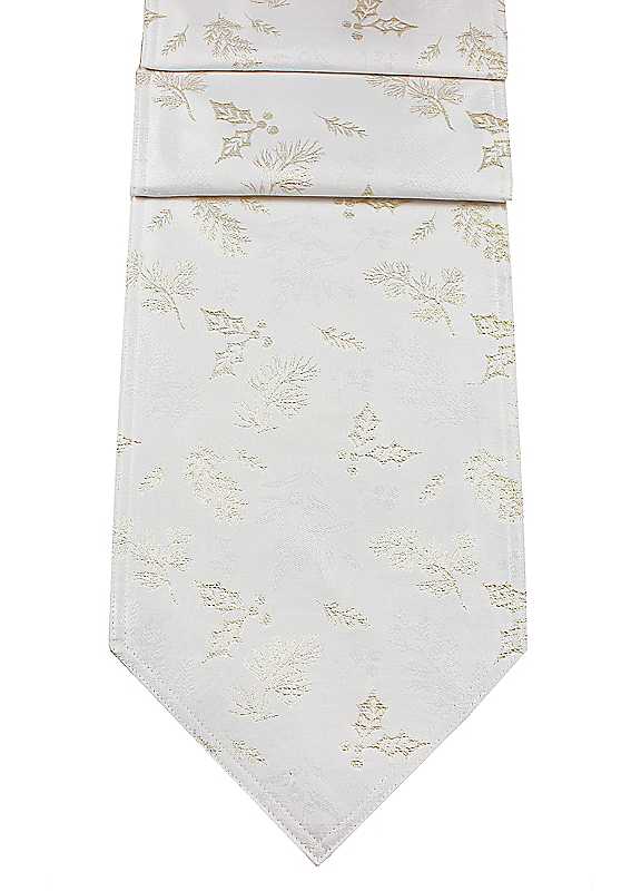 Elevate your table d©cor with this exquisite damask Runner, featuring a delicate winter foliage pattern. Infused with subtle shimmer, this elegant piece adds a touch of warmth and glamour to any setting, creating a sophisticated ambiance for your festive gatherings.Machine washableLine dry100% PolyesterSize approx. 35 x 190 cm