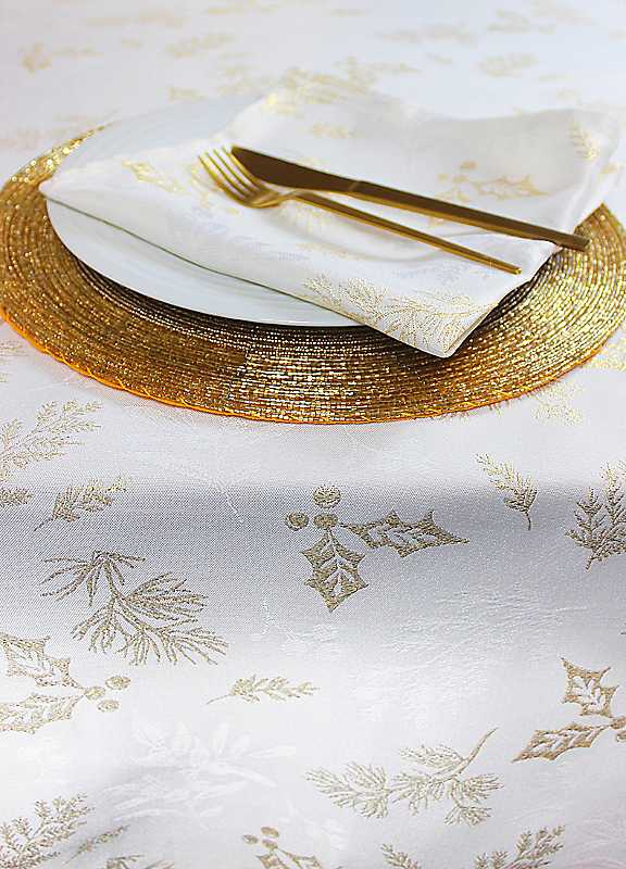 Elevate your table d©cor with this exquisite damask tablecloth, featuring a delicate winter foliage pattern. Infused with subtle shimmer, this elegant piece adds a touch of warmth and glamour to any setting, creating a sophisticated ambiance for your festive gatherings.Machine washableLine dry100% Polyester