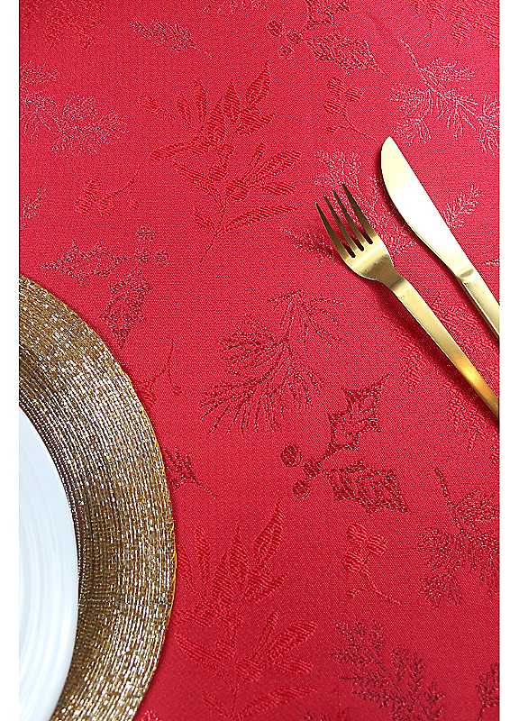 Elevate your table d©cor with this exquisite damask tablecloth, featuring a delicate winter foliage pattern. Infused with subtle shimmer, this elegant piece adds a touch of warmth and glamour to any setting, creating a sophisticated ambiance for your festive gatherings.Machine washableLine dry100% Polyester