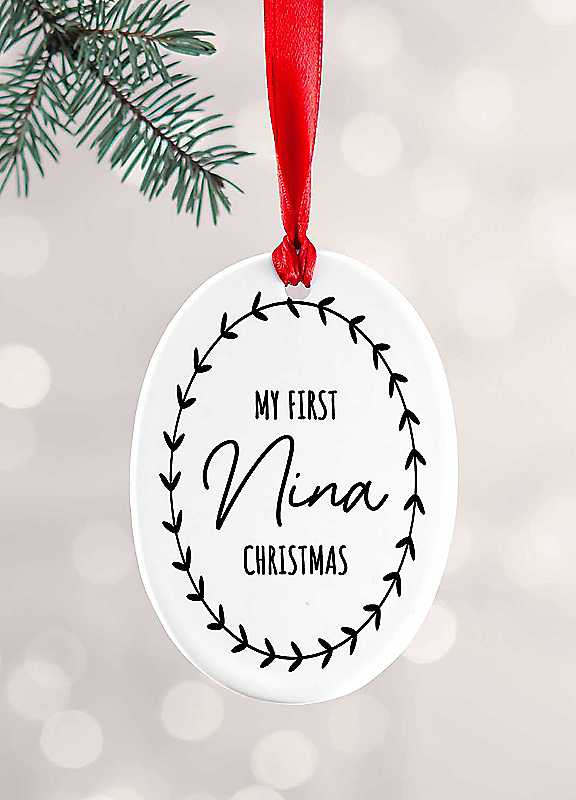 A wonderful personalised gift for a little one's first Christmas! Made from ceramic this printed oval ornament is a lovely trinket to hang on your Christmas tree.Featuring a cute Christmas wreath design and tied with a ribbon, this Christmas tree decoration will be a stunning addition to any tree.Personalise with a name, a Christmas ornament they will treasure forever! A lovely way to celebrate a baby's first Christmas.Name: Up to 12 charactersDimensions approx. 8H x 6W x 0.3D cm | custom christmas ornament, porcelain christmas ornaments, miniature christmas decorations, ceramic christmas ornaments, ceramic christmas decorations, ceramic tree ornaments, personalized christmas ornaments, personalized ceramic ornaments, white ceramic ornament, xmas wreath decorations, first christmas ornament