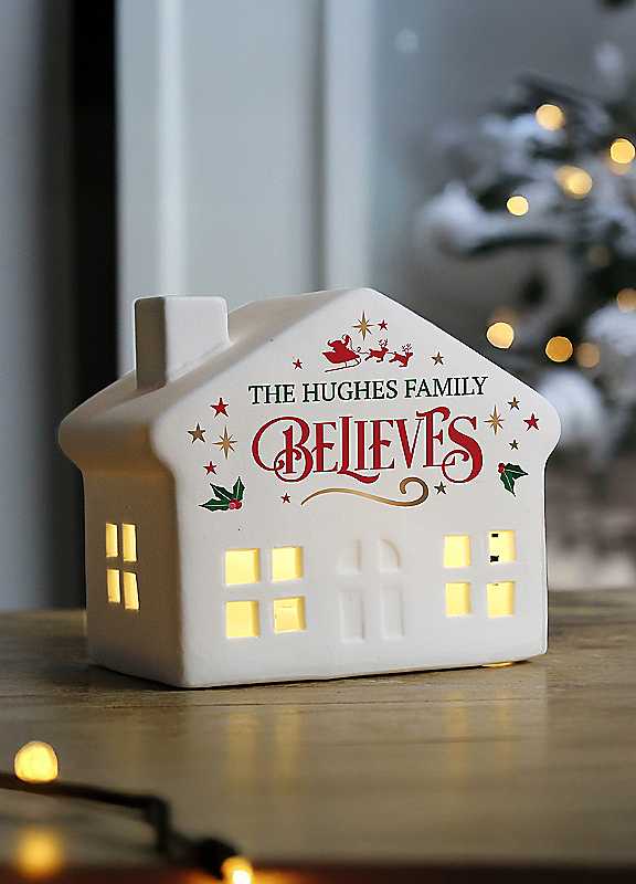 Bring a warm festive glow to your home this Christmas with our charming ceramic LED light-up house. Crafted with delicate cut-out windows, it shines beautifully when lit, filling any room with seasonal magic.You can personalise the house with a name or message of up to 20 characters, which will appear above the fixed word 'believes'. This thoughtful detail makes it a unique decoration and a special keepsake to treasure year after year.The house is perfectly sized for a mantelpiece, shelf or windowsill. It features a simple on/off switch at the base for easy use.A wonderful way to celebrate the joy of Christmas, this personalised decoration is perfect for gifting or adding a magical finishing touch to your own festive display.Age Suitability: 16+Message Line 1 - 20 Characters100% CeramicDimensions approx. 10H x 13W x 7.5D cm | christmas house decorations, fireplace christmas decor, christmas window decorations, christmas table decorations, christmas light decorations, christmas decorations indoor