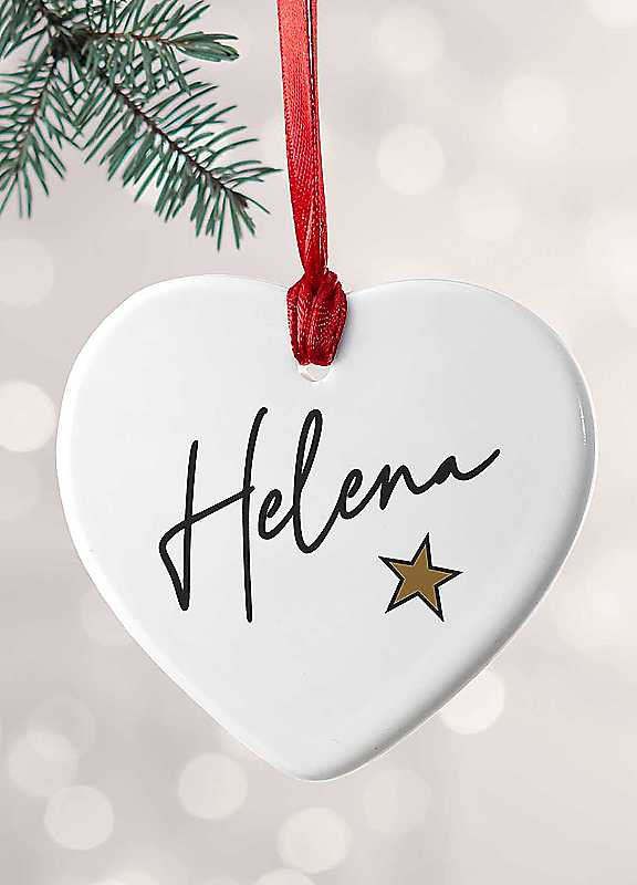 A wonderful personalised Christmas decoration that will hang with pride on any tree! Made from stunning ceramic, this printed heart ornament is a lovely trinket.Featuring a gorgeous script name and star, this Christmas tree decoration will be a stunning addition to any tree.Personalise with a name, a Christmas ornament they will treasure forever!A lovely gift for anyone who would like a personalised touch added to their Christmas decorations.Name: Up to 12 charactersDimensions approx. 7.5H x 7.5W x 0.5D cm | heart christmas ornament, ceramic christmas ornaments, star christmas decorations, personalized christmas ornaments
