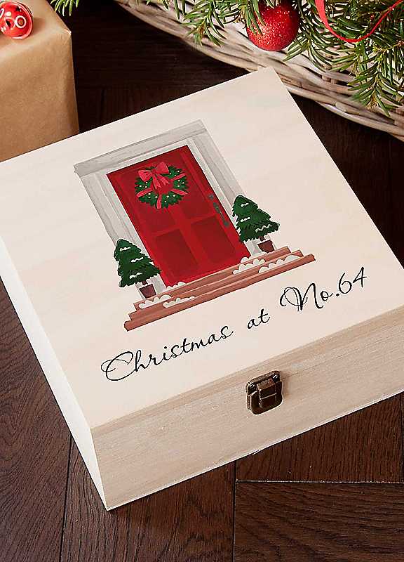 Knock knock! Take the magic of Christmas right to your family's front door with our stunning personalised door number Christmas box. A beautiful, handcrafted gift that'll bring the whole family together this Christmas! The focal point of the image is a striking red front door, to represent your family's abode, with a Christmas wreath on it and a brightly lit Christmas tree on either side.Personalise with your family's door number and our outstanding team of creative specialists will professionally print it onto their gorgeous Christmas box for a truly one-of-a-kind gift for the family, that'll make those Christmas festivities a little bit more magical.'Christmas at no' comes as standard text.Door Number: Up to 8 charactersDimensions approx. 24.5L x 24W x 11.0H cm | personalized christmas decorations