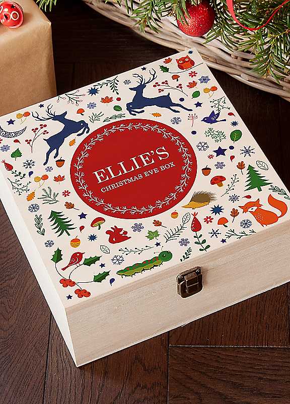 Bring a little extra magic & sparkle to Christmas Eve this year with a Christmas Eve Box filled to the brim with treats for that special little one.Children are always desperate to open 'just the one present' the night before Christmas over excited and full of Christmas joy they just can't wait till the morning to see what Father Christmas has left for them. Start a new tradition this year which will stop the nagging and keep little ones content and busy until it's time to go to sleep.The festive box is printed with a beautiful traditional print design featuring fun woodland characters!The words 'Christmas Eve Box' come as standard text. Please be sure to add the name exactly as you would like it printed for example if the name is Thomas please write Thomas.Name: Up to 12 charactersDimensions approx. 24.5L x 24W x 11H cm