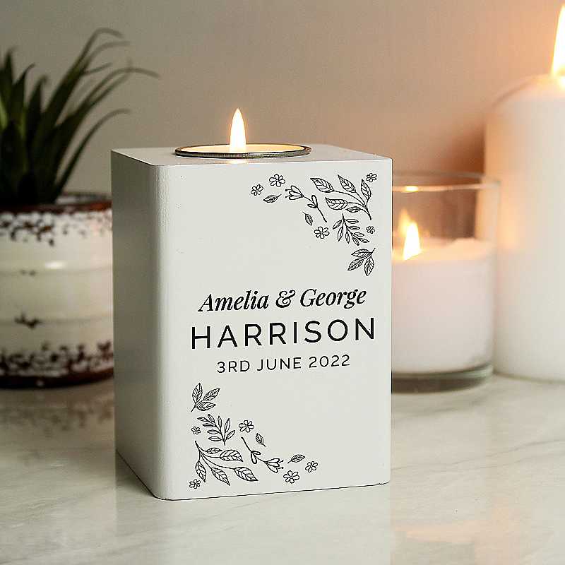 Personalised Floral Leaf White Wooden Tea Light Holder