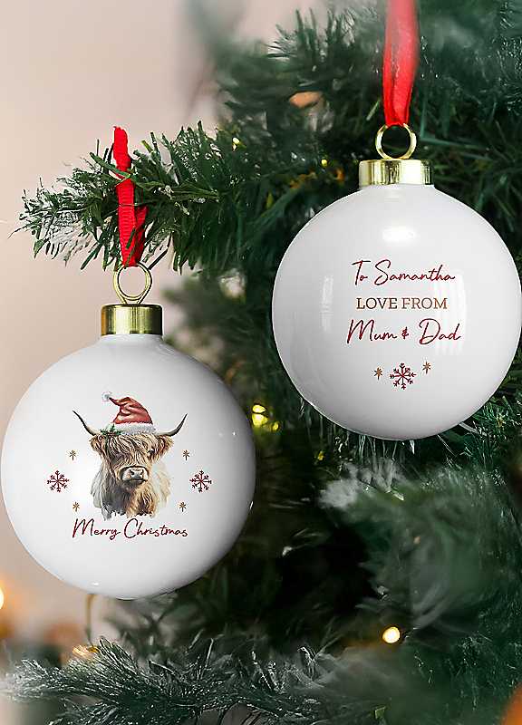 Bring a touch of rustic charm to your festive d©cor with this delightful personalised Highland Cow Christmas bauble. Featuring the much-loved Highland cow, this ornament captures warmth and character, making it a perfect addition to any Christmas tree.The bauble can be personalised on the reverse with up to three lines of text, each line containing up to 20 characters, creating a unique decoration or thoughtful gift.Each bauble is supplied with a ribbon so it's ready to hang straight onto the tree.Age Suitability: 14+Message Line 1 - 20 CharactersMessage Line 2 - 20 CharactersMessage Line 3 - 20 Characters100% Ceramic