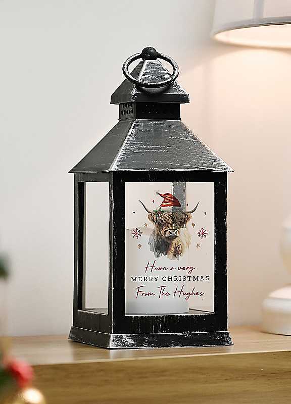 Bring a touch of rustic charm to your festive d©cor with our Personalised Highland Cow Christmas LED Lantern.This beautifully crafted lantern features a delightful Highland cow design, perfect for adding a warm countryside feel to your home this holiday season. Softly illuminated with battery-powered LED lights, it creates a cosy glow that's ideal for mantelpieces, windowsills, or as a magical table centrepiece.Personalise this lantern with up to 3 lines of text, each containing up to 20 characters.Please note, the text on lines 1 & 3 is case sensitive and will appear as entered. All other personalisation will appear in fixed UPPERCASE.The battery-powered lantern has a realistic flickering warm orange flame effect, adding an ambient touch to any room.The lantern is easy to hang around the home with the hoop attached.The lantern can be switched on/off from a switch on the base.Please note that the lantern is supplied without batteries. The lantern requires x3 AAA batteries.This product has a matt plastic finish.Suitable for indoor use only.Ideal for Christmas.Age Suitability: 4+Message Line 1 - 20 CharactersMessage Line 2 - 20 CharactersMessage Line 3 - 20 Characters100% Plastic | decorative candle lantern, rustic lantern, christmas light decorations, christmas lanterns