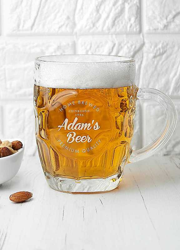 A traditional beer stein for your home brewed beer (opening a can is a lot of effort when you're drunk!) - our sleek personalised home brewed dimpled beer glass will make the perfect gift for him! An awesome birthday gift for that beer loving man in your life, fun Father's Day gift or quirky Valentine's gift for your boyfriend.Etched by our amazing team with a name, year and location of your choice. Your dimpled beer glass comes with curved 'Home Brewed' and 'Premium Quality' standard text above and below the personalisation respectively. Under 'Home Brewed' is the location, the next line is the year which is placed directly above '(your loved one's name)'s Beer' which is written prominently in bold white script-style text.Location: Up to 14 characters.Year: Up to 4 characters, Name: Up to 12 charactersHolds approximately 1 pintMaterial: GlassDimensions approx. 13 x 13 x 12 cm