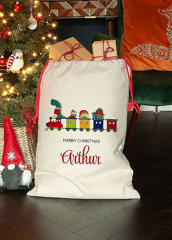Looking for a handy place to store your little one's presents on Christmas morning (we know how messy it can be!), that doubles up as a cute memento, they'll keep as they grow up? Then look no further than our personalised Kids Christmas Train Christmas sack.Personalise your loved one's Christmas sack with their name for a gift and our outstanding team of artisan specialists will professionally print it for them.Name: Up to 12 charactersDimensions approx. 50 x 68 cm | childrens christmas decorations