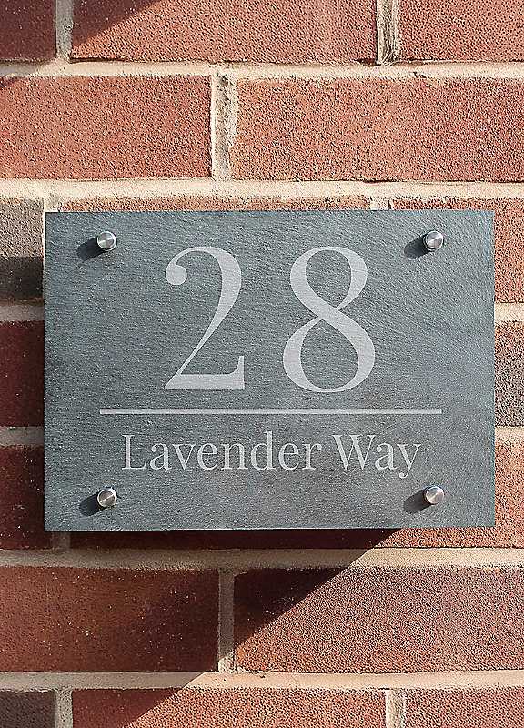 A stylish and modern personalised Slate House Sign that will make their home stand out from the rest!Personalise this sign with a house/flat number of up to 3 digits and 1 line of text of up to 20 characters. Please note that personalisation is case sensitive and will appear as entered.Suitable for both internal and external display.Comes with screw holes, screws, wall plugs and instructions to attach.Number - 3 charactersLine 2 - 20 charactersSlate