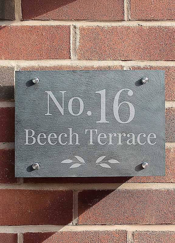 This stunning Slate House Sign features a stylish leafy effect that is sure to make any home stand out!Personalise this sign with 2 lines of text of up to 20 characters each. Please note that personalisation is case sensitive and will appear as entered. 'No.' is fixed text and cannot be changed. Suitable for both internal and external display.Comes with screw holes, screws, wall plugs and instructions to attach.Line 1 - 20 charactersLine 2 - 20 charactersSlate