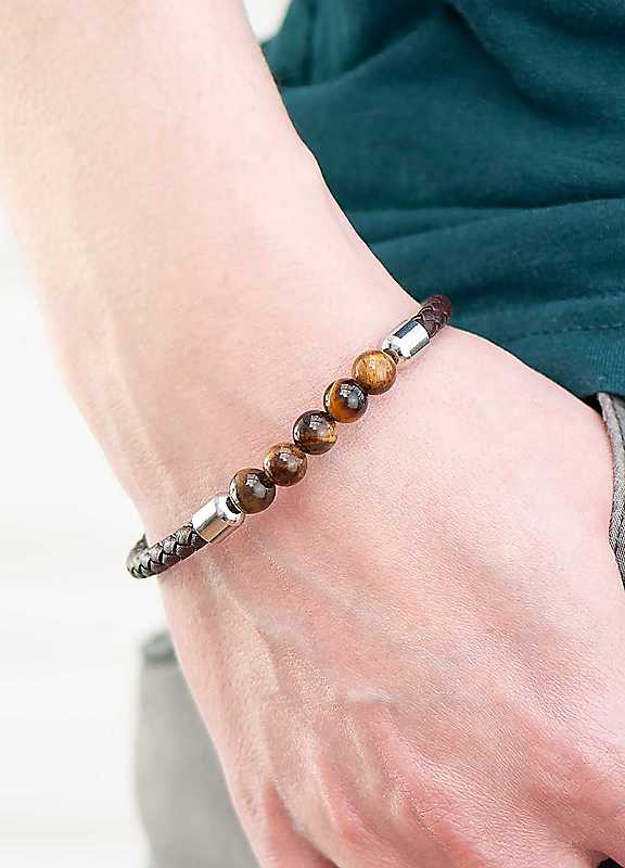 Our chic and elegant personalised men's woven tiger's eye bracelet is sure to be a gift that he will love and cherish. This beautiful piece of jewellery is made from woven leather with beaded tiger's eye gemstone accenting it, adding an extra bit of timeless flair.Personalise his bracelet with his initials and a heartfelt message, making it a truly unique and special way of showing him just how much he means to you.Initials: Up to 3 characters, Message: Up to 15 charactersOpen length approx. 21 cm, Closed diameter approx. 8 x 0.8 x 0.8 cm | beaded woven bracelet, brown leather bracelet, braided leather bracelet, tiger eye bracelet, woven bracelet men