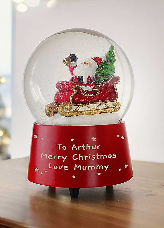 Bring festive magic to your home with this delightful Personalised Christmas Santa Snow Globe. Inside the dome, Christmas Santa sits in his sleigh, holding a bell, and when you wind the mechanism underneath, it plays the classic tune of Jingle Bells, bringing both music and cheer to your display. Crafted from durable plastic, this charming snow globe makes a perfect keepsake for the festive season.Personalise the resin base with up to three lines of text, each containing up to 20 characters. The engraving is beautifully detailed, creating a unique and lasting memory.Measuring 14 cm tall and 10 cm wide and deep, it's the perfect size for a mantelpiece, shelf, or festive corner. Message Line 1 - 20 Characters Message Line 2 - 20 Characters Message Line 3 - 20 Characters 50% Resin, 50% Plastic