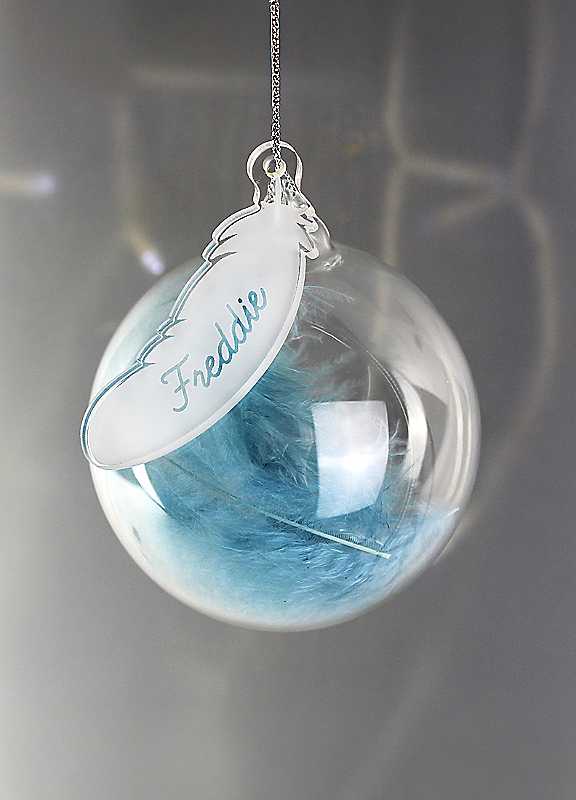 This Personalised Blue Feather Glass Bauble with Feather Tag will make a stunning addition to the Christmas tree. The Acrylic feather tag can be personalised with a name up to 12 characters. Please avoid entering the name in block capitals, as this may result in it being difficult to read. Each glass bauble is filled with a delicate blue feather, which will look great hung on any Christmas tree!Brand: Personalised MomentoName - 12 CharacterPlease note these are handmade so there may be some slight imperfections such as small water marks due to the manufacturing process. Please ensure that the clear protective film has been removed from the acrylic prior to use.