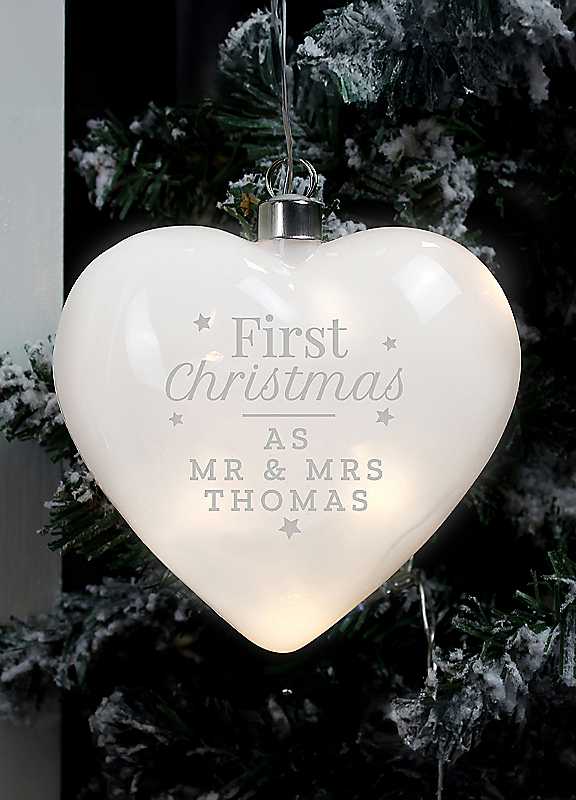 Celebrate a special 'First Christmas' with our LED Frosted Glass Heart, a beautiful keepsake that adds a warm glow to any festive setting. This elegant ornament features the fixed text 'First Christmas' and can be personalised with your own message over three lines, making it perfect for a baby's 1st Christmas, a couple's first married Christmas, or even celebrating your first Christmas in a new home. With a convenient on/off switch, this decoration is easy to use - simply slide the battery compartment from the silver tubing to insert 2 AAA batteries (not included). Once lit, the soft LED glow creates a magical atmosphere, and the heart can be hung up for all to admire. A thoughtful, personal touch to any Christmas decor!Brand: Personalised MomentoLine 1 - 15 CharacterLine 2 - 15 CharacterLine 3 - 15 Character | first christmas ornament, personalized christmas ornaments, glass christmas ornaments, frosted glass ornaments, lighted christmas ornaments, heart christmas ornament